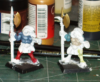 Here are my examples. The model on the left got a mix of VGC Glorious gold and GW Scorched Brown. The model on the right got a mix of P3 Brass Balls and VMC English Uniform. (and yes, the wrong paint bottles are by the miniatures).